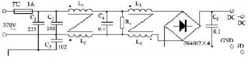 采用無源的EMI濾波器是抑制傳導干擾最有效的辦法。即在電路中插入一個帶通濾波器,讓50 Hz交流電暢通,其余頻率的信號受阻。但要嚴格控制濾波器LC元件的寄生參數,它們的制作工藝、安裝位置、走線方式,都會影響EMI濾波效果。加接圖1所示的濾波電路,可以控制通過傳導耦合進入電網的噪聲電平。