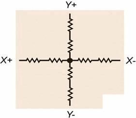 在最簡單的四線(Four-wire)電阻式連接中,頂層兩端和低層兩端分別各連接兩個電極,兩層的電極互相呈九十度交叉,形成四線星狀連接結構,這實際上就是一對彼此正交的電位計(圖2),相當于機械操縱桿的平面屏幕模擬。為了在X軸方向測量觸摸位置,觸控板的控制器將X-設為接地,而X+偏置為參考電壓,然后從Y層的兩端讀取電壓,以找出X軸上兩層的接觸點。同樣地,控制器透過在Y層的電極上加載驅動電壓,并從X層讀取觸摸點電壓,可以確定Y軸上的觸摸位置。