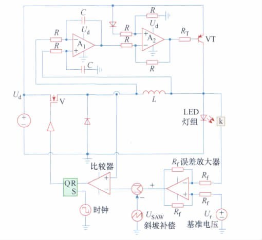 本文提出一種有源紋波補償BUCK 型LED 驅動電路。該電路無需使用大容量電解電容,所需要的小容量電容可以采用能量密度較小的新型長壽命電容,利用有源補償技術抑制輸出紋波電流。由于取消電解電容的使用,可以使電路壽命增長,穩定性提高,便于集成,電路易小型化。