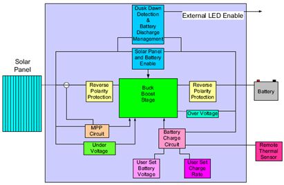 在白天時間系統對電池充電,而在夜間電池放電照亮定義的空間。雖然輸入能量不能保證,但輸出能量可在相當長的時間保持不變。如果一個系統的大小不合適,電池可能因放電而損壞。要防止電池損壞,必須用LED電路抑制操作,防止電池耗盡。