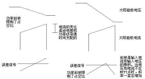 為了從功率可變的電源(即太陽能電池板)析取出最大的功率,太陽能控制器必須采用MPPT。MPPT必須首先找到最大功率點并及時調整環境條件,以保持控制器接近最大功率點。動態MPPT用在系統發生改變的情況下。由于每個開關周期都在發生變化,太陽能電池板汲取的功率也會在每個周期有明顯的改變。動態MPPT利用太陽能電池板的電壓驟降乘以每個開關周期增加的電流,以確定將要產生的誤差信號來調節占空比。動態響應可檢測IV曲線的斜率,從而建立一個功率斜坡,從誤差信號相交點建立一個代表占空比的功率。當斜坡變化斜率從正到負時該周期結束,如圖2所示。
