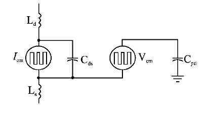由于需要分別對DM 噪聲和CM 噪聲進行分析,所以對DM 噪聲源和CM 噪聲源也需要分別建模。M.Nave提出使用電流源作為DM 噪聲源,使用電壓源作為CM 噪聲源的方法,就是因為DM 噪聲主要由di/dt引起,而CM 噪聲則主要由dv/dt引起。在此基礎上對CM 噪聲源進行改進,考慮了電壓過沖和下沖,并且在線路阻抗近似平衡的情況下,利用DM 電流源和一個電壓源來表示CM 噪聲源(如圖2所示)。