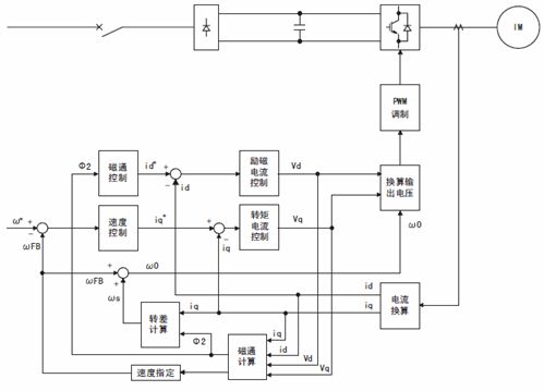 由于矢量變頻器可以分別對電動機的磁通和轉距電流進行檢測、控制,自動改變電壓和頻率,使指令值和檢測實際值達到一致,從而實現了矢量控制。雖然它是開環控制系統,但是大大提升了靜態精度和動態品質,轉速精度可達5%。轉速響應也較快。在設備要求不是十分高的情況下,采用該方案是非常合適的,它可達到控制結構簡單,可靠性又高的實效。圖1為無速度傳感器矢量控制的系統框圖: