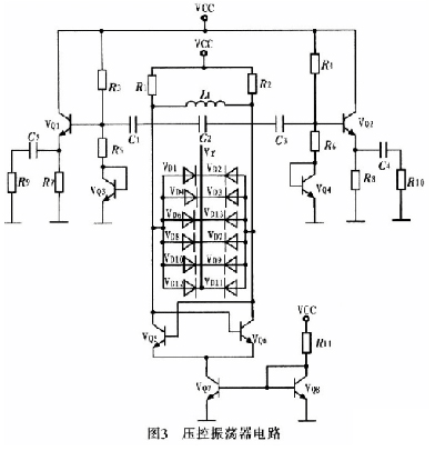 壓控振蕩器按構(gòu)成原理可分為反饋型振蕩器和負(fù)阻型振蕩器2大類(lèi)。這里采用負(fù)阻型振蕩器,其主要是由負(fù)阻器件和諧振回路組成的振蕩器,利用負(fù)阻器件的負(fù)電阻效應(yīng)與諧振回路中的損耗正電阻相抵消,維持諧振回路的穩(wěn)定振蕩。圖3為壓控振蕩器電路。