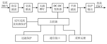 本文設計的整流模塊的工作原理框圖如圖2 所示,工作時, 模塊首先通過過防雷處理和濾波對輸入的三相交流進行處理, 這樣才能保證模塊后級電路的安全; 經過處理后的三相交流經過整流和無源PFC 后轉換成高壓直流時, 這時轉換的高壓直流要經過DC/ DC 變換器再次轉換成可變的直流電壓輸出; 另外模塊控制部分還有負責過壓、過流以及短路保護等作用, 這樣才能保證輸出電壓的穩定, 也同時能對模塊各部件進行保護。模塊還在遠程監控中提供了 四遙 ( 遙控、遙調、遙測、遙信) 接口。