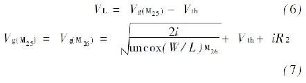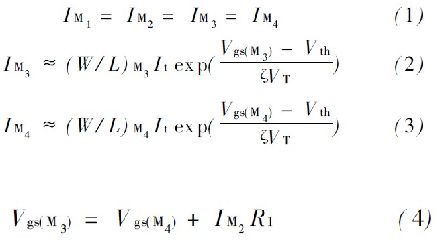 式中: K = (W/ L ) M4 / ( W/ L ) M3 ,通過(guò)式(5) 可以發(fā)現(xiàn),偏置電流I M1 , I M2與輸入電源無(wú)關(guān)。
