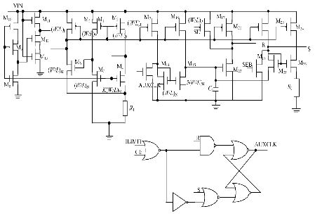 SE 為輔助振蕩器切換信號(hào), SEB 為SE 的反信號(hào)。當(dāng)V DD低于1. 9 V 時(shí), SE 為高電平, M17 , M18 都截止, 不影響R, S 觸發(fā)器的翻轉(zhuǎn), 輔助振蕩器工作, 開(kāi)關(guān)S1 斷開(kāi), S2 閉合; 當(dāng)VDD 高于1. 9 V 時(shí), SE 為低電平, 輔助振蕩器關(guān)斷, 開(kāi)關(guān)S1 閉合, S2 斷開(kāi), M17 , M18 都導(dǎo)通, R=1, S= 0, AU XCLK 被鎖定為高電平, 既減小了功耗, 也避免了輔助振蕩器關(guān)斷之后R, S 端出現(xiàn)不確定狀態(tài)。