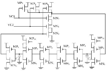 本文所設(shè)計(jì)的主振蕩器采用如圖2 所示的環(huán)形振蕩器結(jié)構(gòu)。VC1, VC2 分別為過(guò)壓保護(hù)電路, PWM 比較器的輸出信號(hào), MP10和MP11 為帶隙基準(zhǔn)提供的鏡像電流, 合理的控制鏡像電流和電容C1 , C2 的大小, 即能夠使主振蕩器在1. 9~ 8 V 的V DD區(qū)間輸出350 kHz 左右較穩(wěn)定的振蕩頻率。