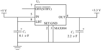由于nRF2401的供電電壓范圍為1.9~3.6V,而AT89S51單片機的供電電壓是5V,為了使芯片正常工作,需要進行電平轉換和分壓處理,設計采用MAXIM公司的MAX884芯片進行5V到3.3V 電平轉換,如圖5所示。