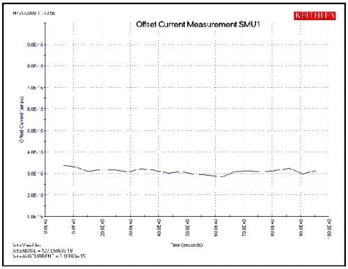 確定了安培計的偏移電流后,將系統的其余部分逐步添加至測試電路,通過重復電流(0V)和時間圖,驗證系統其余部分的偏移(利用圖3中所示的“Append Run”按鈕)。最后,在“up”位置對探針末端或未連接器件的測試夾具進行測量。該過程將有助于確定任何故障點,例如短路的電纜或測量電路中的不穩定性。然而,要意識到,連接和斷開電纜都會在電路中產生電流。為了進行超低電流測量,可能有必要在改變測試電路的連接后等待幾分鐘至幾個小時,使雜散電流衰減。圖4中的圖形顯示的是以下條件下的偏移:1)SMU的Force HI端子上戴有金屬帽;2)前置放大器上僅連接一根三軸電纜;3)通過吉時利7174A型小電流開關矩陣至探針臺,“up”位置有一個探針。