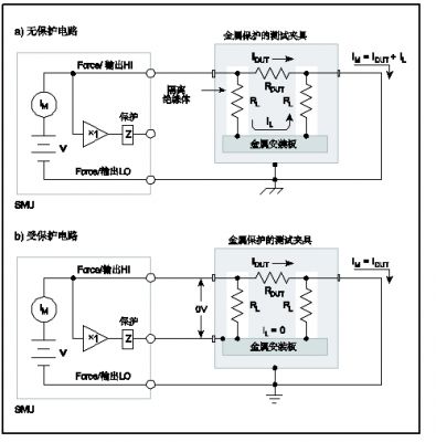 在圖11b中,金屬安裝板被連接至SMU的保護端子。隔離絕緣體頂部和底部的電壓接近相同電勢(0V壓降),所以在隔離絕緣體中就不會有漏流影響測量準確度。由于金屬安裝板將處于保護電勢,所以為安全起見,金屬屏蔽必須連接至地。