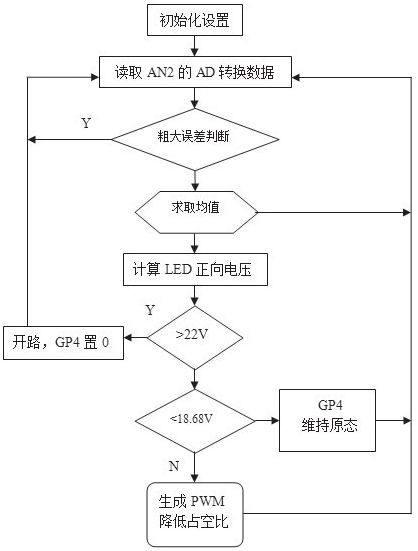 PIC12F675初始設(shè)置GP4輸出高電平,如測(cè)得LED正向電壓在合理范圍內(nèi),則維持高電平輸出使LM3404正常工作;如LED正向電壓逐漸變低并低于設(shè)定值18.68V,則在GP4引腳輸出PWM信號(hào),其占空比可依次降低,直至LED正向電壓低于設(shè)定值。當(dāng)測(cè)得LED正向電壓很高時(shí)可判定輸出開(kāi)路, PIC12F675可輸出低電平關(guān)閉LM3404的輸出。