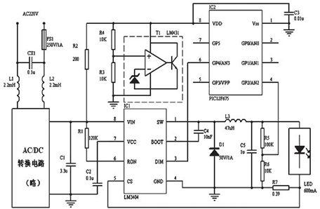 原理圖中,CX1、L1、L2組成輸入EMC濾波電路,經(jīng)AC/DC轉(zhuǎn)換輸出24V直流,如為電池供電的應(yīng)急照明、太陽(yáng)能照明、及車(chē)載照明等應(yīng)用時(shí),則該部分省略。R1、LM3404、C4、D1、L3、R7組成典型的恒流驅(qū)動(dòng)電路,對(duì)于4并6串的LED中功率芯片組成的光源模塊,取樣電阻為0.39Ω。R2、R3、R4與LM431組成穩(wěn)壓電路,為PIC12F675提供穩(wěn)定的5V電源和內(nèi)部AD轉(zhuǎn)換的電壓基準(zhǔn)。
