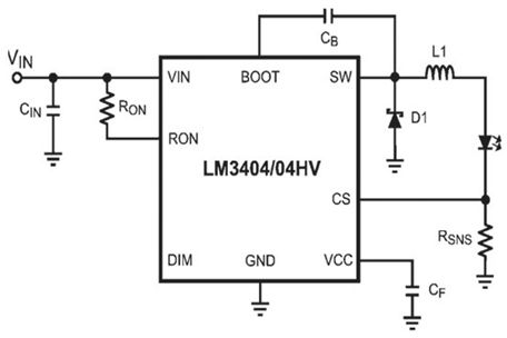 LM3404應(yīng)用十分簡(jiǎn)單,一個(gè)用LM3404的典型應(yīng)用如圖6所示。