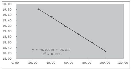 因測(cè)試時(shí)間較短,可以將測(cè)量時(shí)恒溫箱設(shè)置溫度近似等于LED光源的結(jié)溫。在600mA恒流的情況下,通過(guò)數(shù)學(xué)方法不難得出光源模塊正向電壓與結(jié)溫的關(guān)系。利用Excel工具,以溫度為X軸,平均值為Y軸,生成(X,Y)散點(diǎn)圖,選擇線性回歸分析類(lèi)型則可生成如下趨勢(shì)圖和公式。