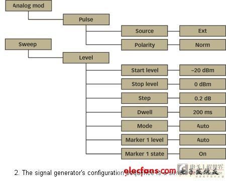 確定所有參數以便DUT的電流消耗不會偏離靜態電流,從而確保穩定的熱反應。信號發生器通過選擇模擬調制清單上的脈沖可選項轉換為脈沖模式。在掃描清單中,選擇功率掃描模式。開始等級被設置為-20dBm,停止等級設置為0dBm。0.2dB的步長可有101個測量點。必須小心選擇停頓時間。如果選擇的值太小,在功率掃描期間可能出現的瞬變會導致DUT損耗的電流與靜態電流偏離。在保持20s的適當短暫掃描時間時,200ms的停頓時間可以忽略其影響。同一個清單上,標志1被設為掃描的開始值,即-20dBm,由選擇“開”狀態激活。圖2顯示了詳細的配置序列。
