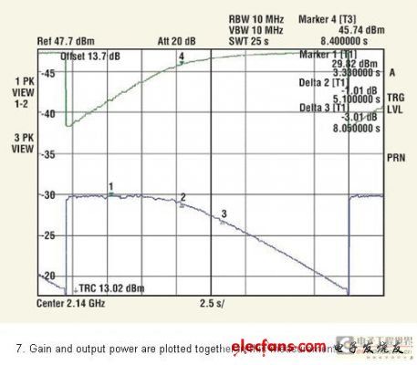 增益(藍線)和輸出功率(紅線)被同時繪制,且每個圖都被“校準”,也就是說,標記讀取值就是絕對值。標記1設置在藍線上的微信號增益上,測量值為 29.8dB。該標記被用作“變量增量標記”的參數。還是增量曲線,一個標記被用于“變量增量標記”模式以確定1dB壓縮級(標記2),另一個以確定 3dB壓縮級(標記3)。當挑選功率線跡后,第四個標記(綠線上的標記4)被設為與標記2或者標記3同樣的橫坐標,以便直接讀取在1或3dB壓縮級上的輸出功率。在該例中,可獲得+45.74dBm的1-dB壓縮級和+46.69dBm的3dB壓縮級。在脈沖條件下進行功率測量的方法允許在高功率RF晶體管和RF集成電路中被快速和方便地執行,消除了以往方法的局限性。