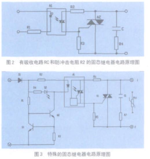 圖1、圖2 和圖3 三種電路都能實現固態繼電器的功能。圖1 是固態繼電器最簡單的電路原理圖,圖中A1 是交流光耦,A 2 是雙向可控硅。常用在小型的S S R ,使用時,用戶往往在外面增加器件來改善性能。圖2 是在圖1 的基礎上增加了RC 吸收電路和防沖擊電阻R2 。R 2是保護光耦,抑制在導通瞬間流過光耦的沖擊電流。附加這些器件后,大大改善了SSR 的EMC 特性和浪涌對光耦的沖擊性能。因此該電路常用在可靠性較高的場合。圖3 是一種特殊的電路,常用在高可靠性和E M C 等級較高的SSR 設計中。圖中的二極管D1 可防止輸入反極性。由Q1、Q2、R1 及R3 組成恒流電路,保證當輸入電壓變化時,光耦A 1 的電流恒定。R C 電路C 1 、R 7 和R 6 的功能與圖2 的相同。該電路還增加了壓敏電阻R V 。R V不僅加強了S S R 的過壓保護能力,而且大大改善了其E M C 性能。