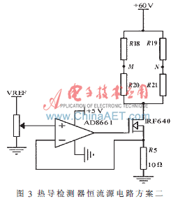 如果只是單純地將IRF640放在電橋的上方,而不加線性光耦HCNR201。如圖4所示,當場效應管IRF640截止,則M、N上的共模電壓為零,這樣雖然可以避免圖3方案的問題,但是當橋流較大時(200 mA,橋電阻為100Ω),則場效應管IRF640的柵極電壓達到20多伏,超過了AD8661的電源電壓范圍(±18 V)。因此圖3、圖4方案都不可行。