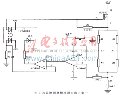 如圖2所示為恒流源的電路圖。輸出信號為M、N,即通過測量M、N兩點間的電位差,就能測出物質的成分和含量。圖2中R5是采樣電阻,阻值10 Ω,當電流為上限250 mA時,采樣電壓為2.5 V,采樣電壓輸入到AD8662的2腳,AD8662的3腳接電位器RW,RW的一端接地,另一端接+2.5 V電壓基準,此+2.5 V是通過穩壓芯片ADR431輸出,溫度穩定1 ppm/℃。設定好電位器的電壓后,當AD8662的2腳、3腳電壓不相等時,其差壓經運放AD8662開環放大(開環放大倍數2.2×105)驅動AD8662的5腳,U1B和線性光耦HCNR201構成光耦隔離的放大電路,放大比為500 K/75 K=6.7倍。AD8662和HCNR201構成放大比1.47×106的差壓放大電路,并且起到穩流作用。當橋流有0.1 μA的波動時,施加到IRF640柵極的電壓變化達1.47 V,使IRF640增加或減小電流,從而消除電流波動。