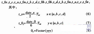 空間矢量調制法只確定開關間隔中應用電壓矢量的占空比,從而獲得低頻率的輸出電壓和輸入電流的平均值,但是并沒有確定使用的順序。所以需要使用雙空間矢量調制法,同時也可改善波形的質量。圖2表明了輸入電流在4扇區,輸出電壓在5扇區應用雙空間矢量調制的順序。電壓矢量在開關間隔中對稱分布,零矢量每4個開關間隔使用一次。在每次開關轉換中只有一個開關狀態發生改變以最大程度地降低損耗。在圖2中通過表格2確定相應開關時間: