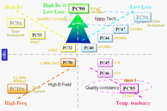下面對高性能的材料做一個(gè)簡單介紹。LED變壓器的系統(tǒng)需要高飽和磁通密度和低損耗的特點(diǎn),TDK開發(fā)了一個(gè)PC47系列的變壓器材料,它的發(fā)展方向就是下圖箭頭所指的方向,縱軸是飽和度磁通密度和低損耗。這邊是我們對比市面一些通用的磁芯變壓器,和TDK現(xiàn)在所研發(fā)和不斷更新產(chǎn)品特性的比較。從右下角,粉紅色的點(diǎn)是目前市場上常用的一些材料的性能,橫坐標(biāo)是磁通量,縱坐標(biāo)是飽和的密度。我們可以發(fā)現(xiàn)從現(xiàn)在市場上這些粉紅色的點(diǎn)是在500Core Loss,磁通密度在380,跟TDK PC40材料是相當(dāng)?shù)摹C47材已經(jīng)有很大的改善,在420的磁通密度,在250左右的Core Loss,也就是說相比通常所用的系列有比較大的改善。