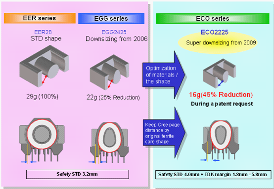 活用高性能材質(zhì)的優(yōu)點(diǎn),以EER28市面上最常用的一種變壓器型號分析。由于密度更大,我們可以使變壓器更輕、更小。比如在同樣功率的情況下,用高性能材質(zhì)體積和重量會(huì)比普通材質(zhì)更小。這邊僅以EER28為例,我們將以ECO2225系列可以取代市場上的EER28,重量有45%的消減。