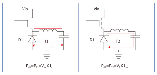 當時間為T2時,輸出電流(Iout)流經(jīng)D1。所產生的損耗與D1的正向電壓(Vfw)和輸出電流直接相關。PT2等于Iout*Vfw。顯然,我們希望盡可能降低以控制損耗,減少發(fā)熱。