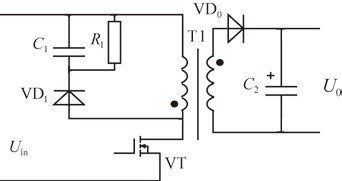 常規單端反激電路結構如圖1所示,該電路的缺點在于功率管VT截止時,變壓器初級的反峰能量,被VD1、C 1和R 1組成的吸收電路消耗掉;而且在輸出功率相同的情況下,功率管通過電流(相對于多管并聯)大,導通壓降高,損耗大,所以效率和可靠性較低。