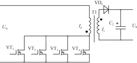 如圖2所示,該電路的特點是,主功率電路采用4只功率管并聯,每只功率管通過的電流為單管應用時的1/4(假定4只功率管參數一致),則功率管的導通壓降也應為單管應用時的1/4.根據計算,在輸出550W時,理論上,4管并聯比單管可減小通態損耗約20W,提高效率近3個百分點。