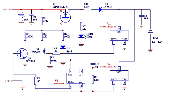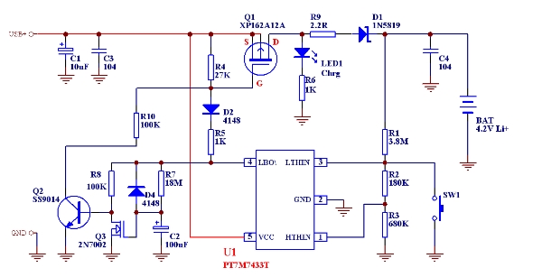 PT7M7433T是上海百利通公司最新設計的極高精度的一系列電壓檢測器的其中一款,其檢測精度在0-Vcc (5.5V)范圍內(nèi)小于1mV,而且其批量IC的檢測值偏差<±2.5%,這樣完全保證了批量產(chǎn)品的性能一致性和極高的總體性能,我們利用其配合少量外部電路即可組成相當簡單的鋰電池充電線路。