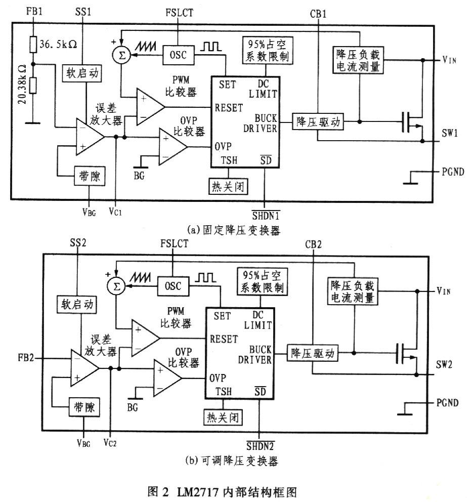 圖2所示為LM2717的內(nèi)部結(jié)構(gòu)框圖。該器件有專門的保護(hù)電路,正常工作時,該電路對LM2717具有保護(hù)功能。當(dāng)器件溫度過高時,熱關(guān)閉電路會切斷電源。OVP比較器在電源啟動和關(guān)閉期間保護(hù)電源裝置,防止器件在最小輸入電壓下工作。OVP比較器被用來防止輸出電壓在沒有負(fù)載情況下上升,允許在滿載條件下的全脈寬調(diào)制(PWM)。當(dāng)電源電流達(dá)到10μA時,該器件會使變換器工作在關(guān)閉模式。