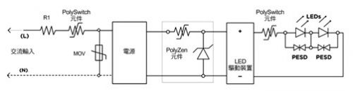 目前,多數LED應用利用功率轉換和控制組件連接各種功率源,如交流電線、太陽能電池板或電池,來控制LED驅動裝置的功率耗散。對這些接口加以保護,防止它們因過流和過溫而受損,常常用到具有可復位能力的聚合物正溫度系數(PPTC)組件(圖2)。可以與功率輸入串聯一個PolySwitch LVR組件,防止因電氣短路、電路超載或用戶誤操作而受損。此外,放在輸入端上的金屬氧化物變阻(MOV)也有助于LED模塊內的過壓保護。