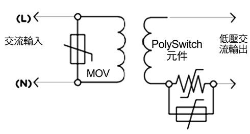 在照明系統中采用第二類功率源可成為降低成本、提高彈性的重要因素之一。固有的有限功率源,如變壓器、電源供應器或電池等,可以包含保護組件,只要不依靠它們限制第二類功率源的輸出即可。非固有型的有限功率源,按照定義,具有一個分立保護組件,當電流和能量輸出達到預定值時它會自動中斷輸出,各種電路保護組件都有助于提供LED照明應用第二類功率源的安全操作。圖4表示了一種協同保護策略的工作原理,它在交流輸入上采用了一個MOV,在輸出電路分支上采用了一個PolySwitch組件,可以幫助廠商滿足UL 1310第35.1小節針對開關和控制裝置的過載試驗要求。