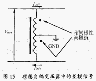 從差模信號看,有中心抽頭的自耦變壓器是兩個(gè)在相位上相同的對分繞組,見圖15。這就意味差模電流在其中所形成的磁場,會使其對差模電流呈現(xiàn)高阻抗。相當(dāng)于對差模信號并聯(lián)了一個(gè)高阻值的阻抗,它對差模信號的大小沒有影響。