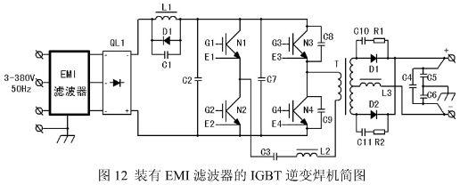 圖 12 是裝有 EMI 濾波器的 IGBT 逆變焊機原理簡圖。為了減少對相鄰設(shè)備的干擾和減少高頻電磁輻射對焊工健康的影響,在焊機輸出端也接了濾波器,其中 C4 用于輸出差模干擾的濾出,C5、C6 用于共模干擾濾出。