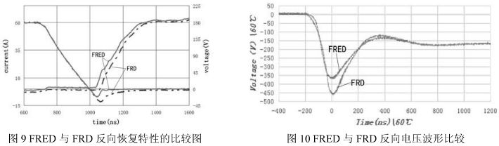 例如FRED就較一般的FRD在恢復(fù)時間、反向電壓等方面有一定的優(yōu)勢。圖9是一種國產(chǎn)FRED與進口FRD反向恢復(fù)特性的比較,圖10是國產(chǎn)FRED與進口FRD反向電壓波形比較。