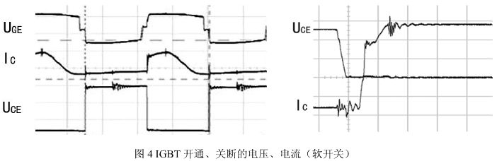 圖4 IGBT開通、關(guān)斷的電壓、電流(軟開關(guān)) 肖介光等:IGBT逆變焊機電磁騷擾的抑制 同時,由于主變壓器的漏感及分布電容在 IGBT 開通、關(guān)斷時,常常產(chǎn)生高頻高壓尖峰震蕩,由此而產(chǎn)生的高次諧波可由多種途徑傳入內(nèi)部電路,也可通過散熱器及主變壓器等途經(jīng)向空間輻射。
