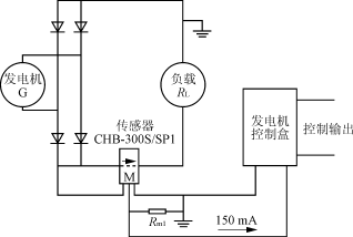 在某型地面車輛上裝備了一套獨立的大功率發(fā)電系統(tǒng),該發(fā)電系統(tǒng)設(shè)計選用了CHB-300S型閉環(huán)霍爾電流傳感器作為系統(tǒng)電流檢測部件,通過對傳感器的輸出信號進(jìn)行處理,設(shè)定限流工作點,確保發(fā)電系統(tǒng)的輸出功率不高于發(fā)電機(jī)的額定功率。閉環(huán)霍爾電流傳感器CHB-300S的應(yīng)用,很好地實現(xiàn)了上述應(yīng)用目的。如圖3所示,發(fā)電機(jī)G輸出正端匯流母線穿過CHB-300S/SP1的原邊電流穿孔,由傳感器CHB-300S/SP1檢測發(fā)電機(jī)的輸出電流,傳感器的輸出IM與發(fā)電機(jī)控制盒相連,由發(fā)電機(jī)控制盒設(shè)定發(fā)電機(jī)的輸出電流控制點,依據(jù)此信號,對發(fā)電機(jī)的輸出電流加以限制,避免發(fā)電機(jī)因輸出功率過高而發(fā)生故障或損壞,從而保證發(fā)電系統(tǒng)正常工作。