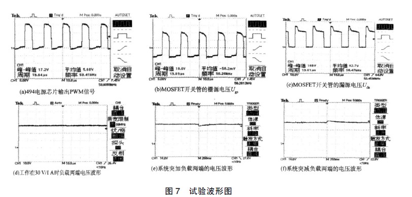 通過調(diào)壓器在供電電源端輸入110 V 的交流電壓, 使得系統(tǒng)穩(wěn)定的工作在30 V、1 A 的負(fù)載下, 觀察TL494 電源芯片輸出的驅(qū)動(dòng)信號(hào)波形、MOSFET 開關(guān)管Ugs、Uds 、負(fù)載正常工作時(shí)的波形、以及突然加載、突然掉載情況, 其試驗(yàn)波形如圖7。