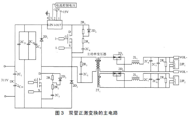 從圖3 可以看出, 電路結(jié)構(gòu)簡(jiǎn)單, 容易實(shí)現(xiàn), 并在MOSFET 橋臂增加了霍爾傳感器, 以保證輸出反饋電流環(huán)的要求。為了增加電路的通用性, 設(shè)計(jì)的電路板增加了雙路輸出的功能, 只要改變變壓器的設(shè)計(jì), 即可以完成多路輸出。當(dāng)兩個(gè)主功率開關(guān)管截止時(shí), 原邊繞組的電壓極性相反, 使另外一橋臂的兩個(gè)二極管導(dǎo)通, 電壓被箝位在輸入電壓值。因此開關(guān)管承受的電壓與輸入電壓相同。在輸入電壓最大值低于350 V時(shí), 開關(guān)管只需要選擇450 V 的耐壓值即可。這里我們選用N 溝道MOSFET , IRF830( 4. 5 A/ 500 V) 。
