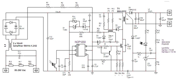 圖 4(a):基于 NCP1250 的 19 V/65 W 適配器電路圖