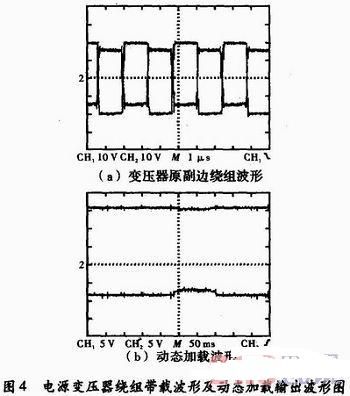 變壓器匝數設計是根據式(2)和式(3)計算,其中μi為輸入電壓最小值,△Vce為額定電流下全橋回路開關管壓降,Dmax=0.48;μo為輸出電壓額定值;△Vd為輸出額定電流下全波整流二極管壓降。理論計算原副邊匝數為:原邊Np=4.6匝,副邊Ns1=5.8匝,Ns2=3.9匝。