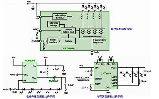 白光LED廣泛用于小型液晶顯示器(LCD)面板及鍵盤背光以及指示器應(yīng)用。高亮度LED則用于手機(jī)和數(shù)碼相機(jī)的閃光光源。這些應(yīng)用需要優(yōu)化的驅(qū)動器解決方案,能夠延長電池使用時間、減小印制電路板(PCB)面積及高度。在這些應(yīng)用領(lǐng)域,常見的LED驅(qū)動器方案涉及線性、電感型或電荷泵型不同拓?fù)浣Y(jié)構(gòu),各有其特點。例如,電感型方案總能效最佳;電荷泵方案由于使用低高度陶瓷電容,占用的電路板面積和高度極小;線性方案非常適合色彩指示器以及簡單的背光應(yīng)用。安森美半導(dǎo)體提供所有這三種類型拓?fù)浣Y(jié)構(gòu)的LED驅(qū)動器方案(參見圖1),滿足用戶不同的應(yīng)用需求。