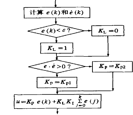 ③當(dāng)│e(k)│≤ε時,即偏差值e(k)進入穩(wěn)態(tài)區(qū)域時,加入積分環(huán)節(jié),可保證系統(tǒng)的控制精度。