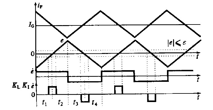 ④在區(qū)間1 和區(qū)間3 中,系統(tǒng)輸出在調(diào)節(jié)器的作用下向給定值I G 接近。為了減小系統(tǒng)穩(wěn)態(tài)誤差,提高控制精度,采用大比例調(diào)節(jié)系數(shù)KP1使反饋電流i F 迅速接近I G.但KP1的增大會使系統(tǒng)的相對穩(wěn)定性降低,甚至造成系統(tǒng)不穩(wěn)定,所以在區(qū)間2和區(qū)間4 采用小比例調(diào)節(jié)系數(shù)KP2 ,以降低電流反饋值偏離給定值的速度。