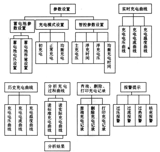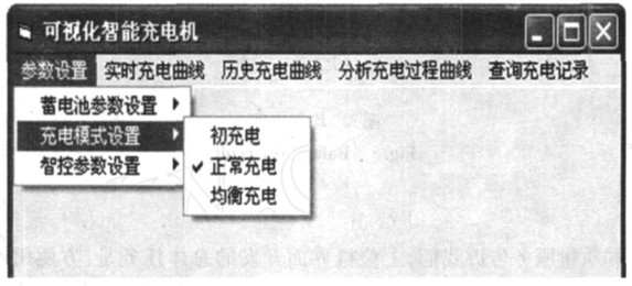 在參數設置中可以對框圖中所示的條目進行設置,使得該系統具有很強的通用性。電動車電池一般由幾個單體組合而成,可以選擇單體個數以確定電池組的電壓和容量。該系統提供了如框圖所示的三種充電模式,一般新電池前五次充電要進行初充電以充分激活電解質,當單體電量不同時要均衡充電,其余時正常充電。還可以按照需求設置不同充電階段的充電時間,來滿足各種電池的不同需求;實時充電曲線實時地顯示充電電流、電壓和電池溫度;歷史充電曲線可以顯示該電池組充電歷史;通過分析充電過程曲線即可了解電池存在的問題,如:蓄電池缺乏電解液、電解液比重不符合要求或蓄電池單體存在差異等,從而及時的對電池進行保養;該系統還提供了按日期或電池編號查詢、刪除充電記錄的數據庫功能,方便了操作;報警提示用來告知用戶充電的過壓、過流、過熱情況以及充電是否結束。