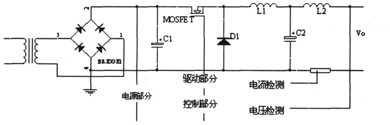 在主充電路中, 220 V電壓經變壓器降壓后,由整流器整流和大電容C1 平滑濾波,作為直流充電電源。MOSFET、二極管D1、電感L1 和電容C2 構成主充電路。在工作過程中, PWM控制信號的高電平脈沖出現,使MOSFET導通之后,電感L1 的電流不斷增大,電容C2 充電,主充變換器不斷存儲能量,同時通過電感L2 對電池充電,此時,續流二極管因反向偏置而截止。經過PWM高電平脈沖持續時間后, PWM信號變低,MOSFET截止,電感L1 中的電流減小, L1 兩端的感應電動勢使續流二極管導通, L1 中的存儲電流和電容C2 存儲電荷向電池充電。經過PWM信號的低電平持續時間后, PWM信號的又一高電平脈沖到來,再度使MOSFET導通,上述過程循環交替。電感L2 的作用是平滑充電電流.