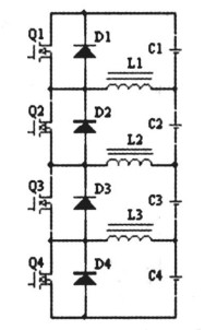 在均衡電路中,以4節電池為例,當對第二節電池均衡時,開啟MOS管Q2,蓄電池C2通過Q2給電感L1、L2充電,然后關斷MOS管Q2,則電感L1中的電流通過二極管D1回饋給蓄電池C1,電感L2中的電流通過二極管D3和D4回饋給蓄電池C3和C4,以達到各個單體均衡的效果。
