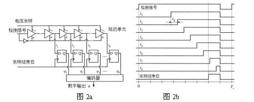 [page]控制處理器由高速A/D轉換器,數字PID補償器和數字DPWM輸出組成。外部存儲器記錄了控制處理器的相關程序。高速A/D轉換器是基于CMOS的傳輸延遲時間td 影響輸入電壓VDD的原理做成的,VDD電壓和傳輸時間是成近似的反比例關系,即VDD越大,信號傳輸延遲時間越小。如圖2所示,以CMOS的輸入電壓VDD作位采樣電壓的輸入口,各信號之間的傳輸時間延時td受采樣電壓VDD影響。第四分之三個采樣周期過后采樣結束位產生高電平,開始記錄q1到q8的輸出,把得到的結果送入編碼器得到數字輸出e,完成A/D轉換。如圖2b所示,數字采樣值為11111100.VDD越大,td越小得到的采樣值越大。